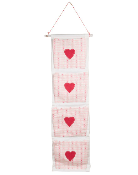 Useful hanging pockets in p ing ones decorated with appliquéd hearts and in patchwork.
